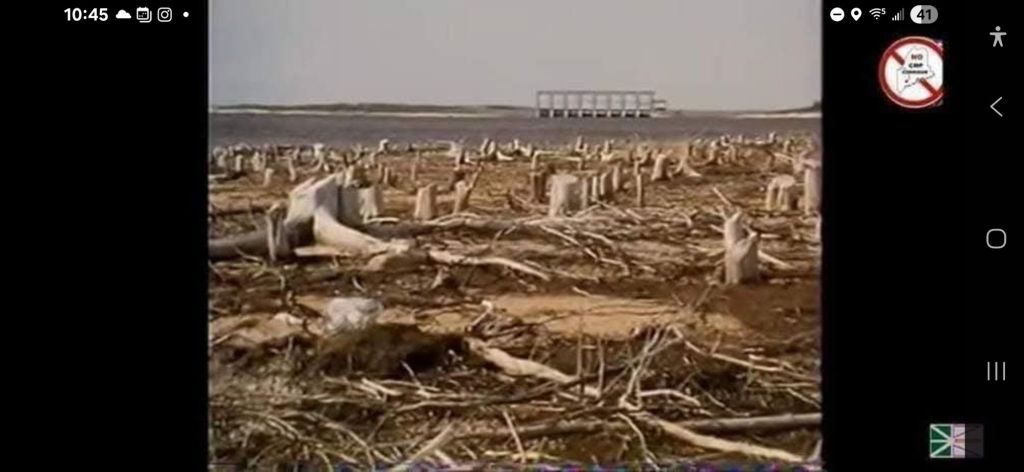 Some of the devastation from the Hydro-Quebec Mega Dams, notice, just one of the hundreds of dams in the background.